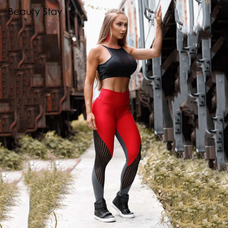 Beauty Stay 2019 New Fashion Net Yarn Patchwork Women Leggings High Waist Push Up Fitness Outside S
